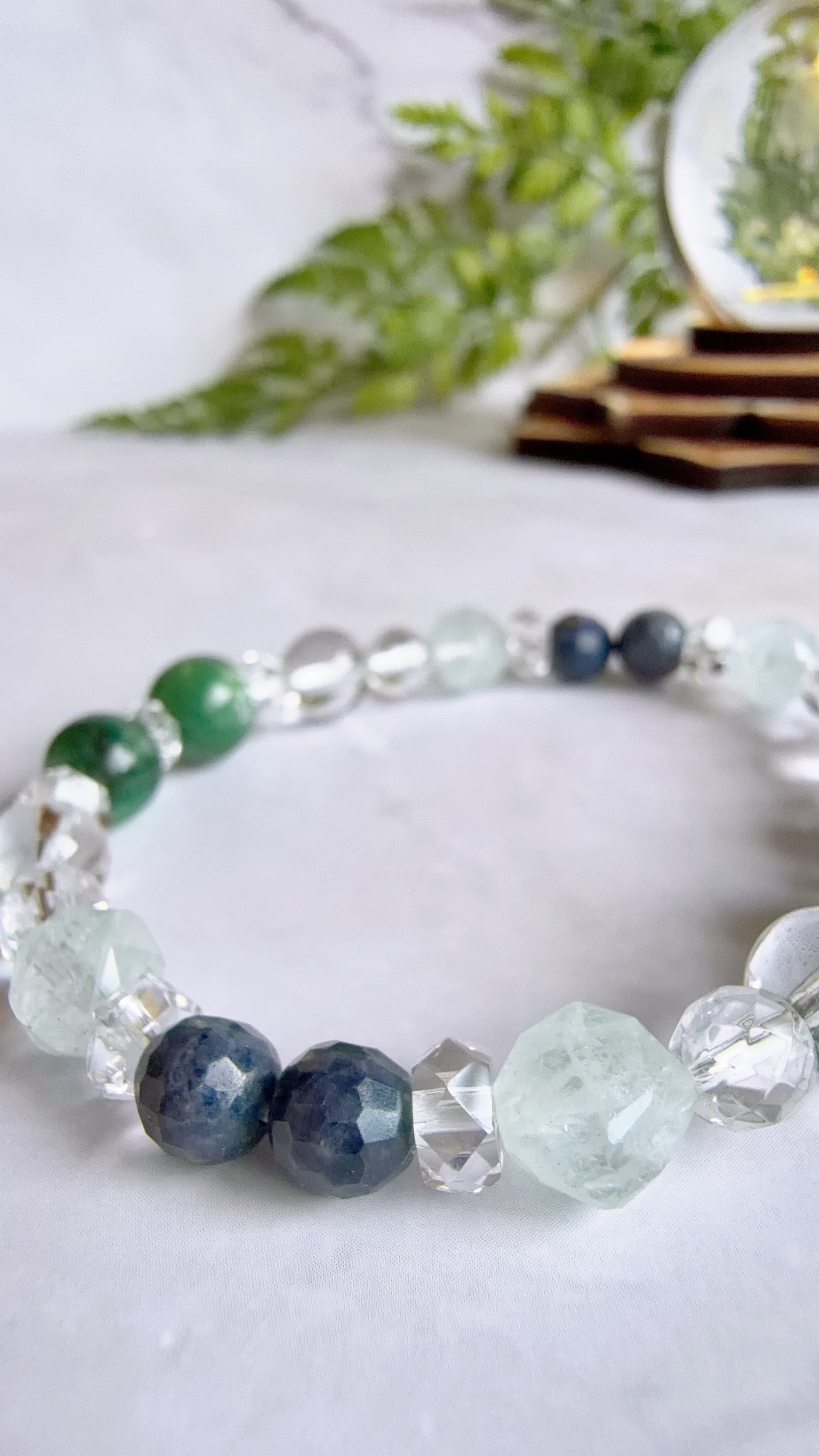 サファイアとアクアマリンの深く美しいブルーを中心に、透明感のある天然石を組み合わせて上品な雰囲気に仕上げました。