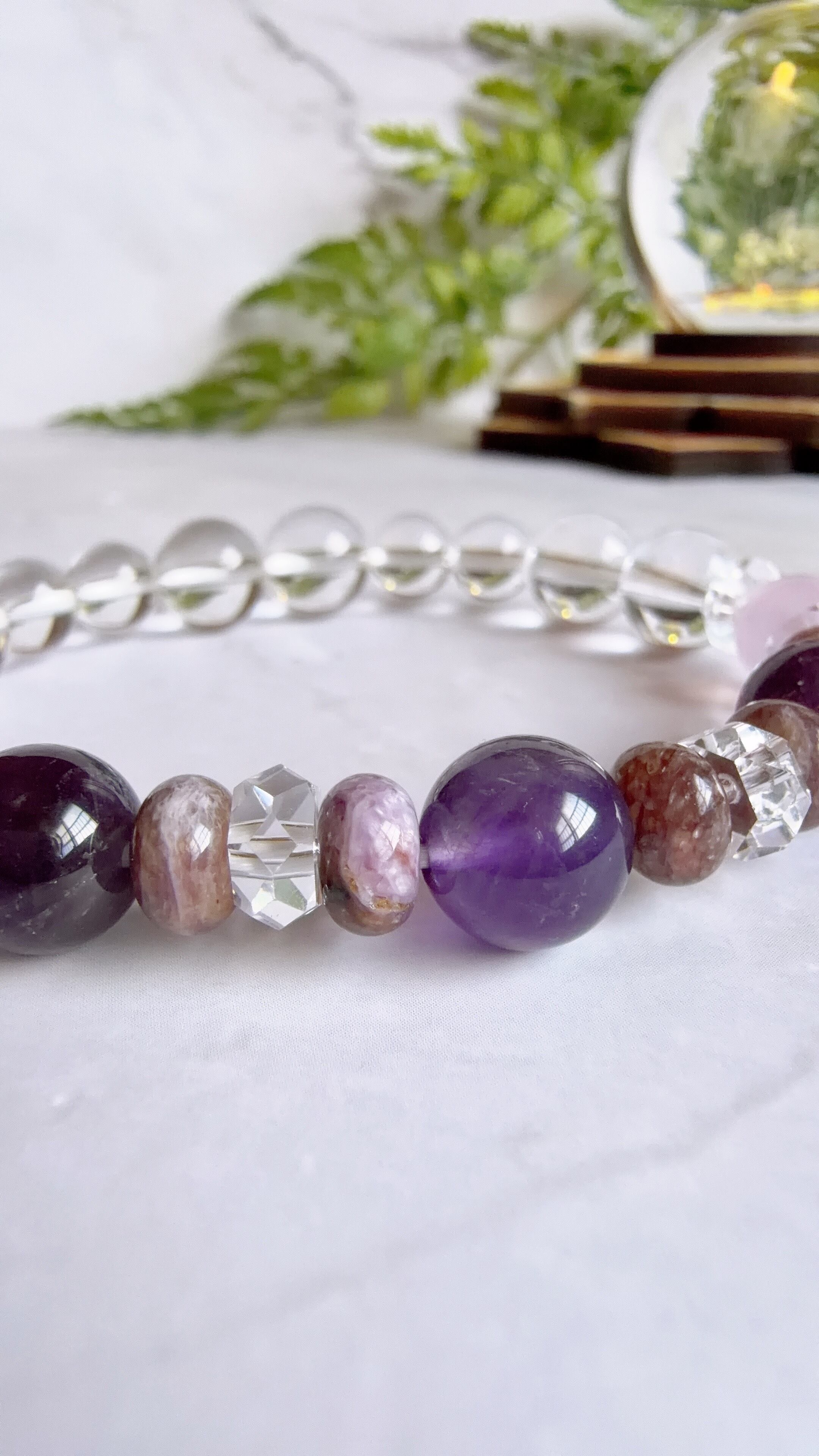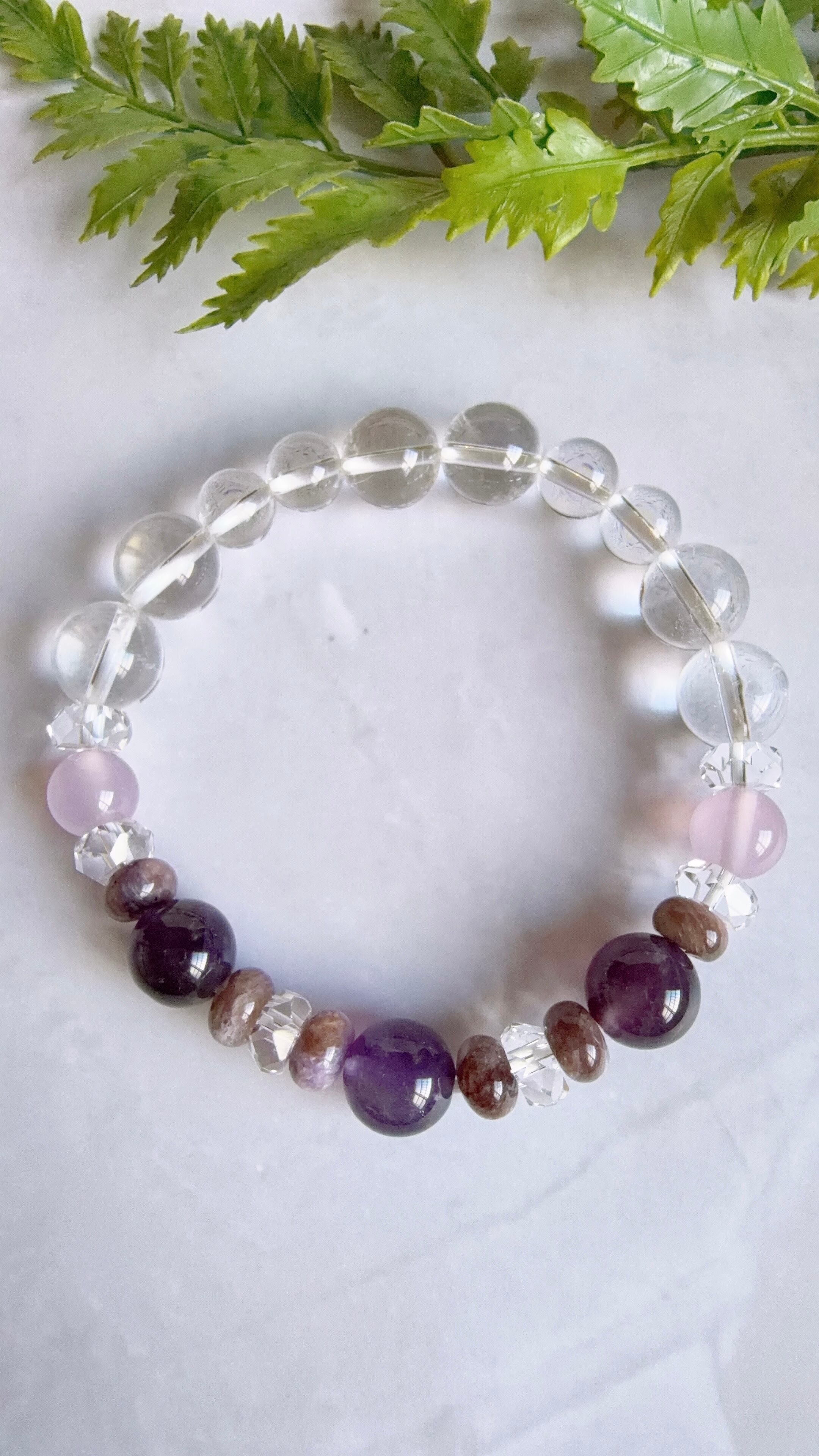 アメジストとチャロアイトの神秘的な紫を中心に、柔らかな天然石を組み合わせて優しい雰囲気に仕上げました。